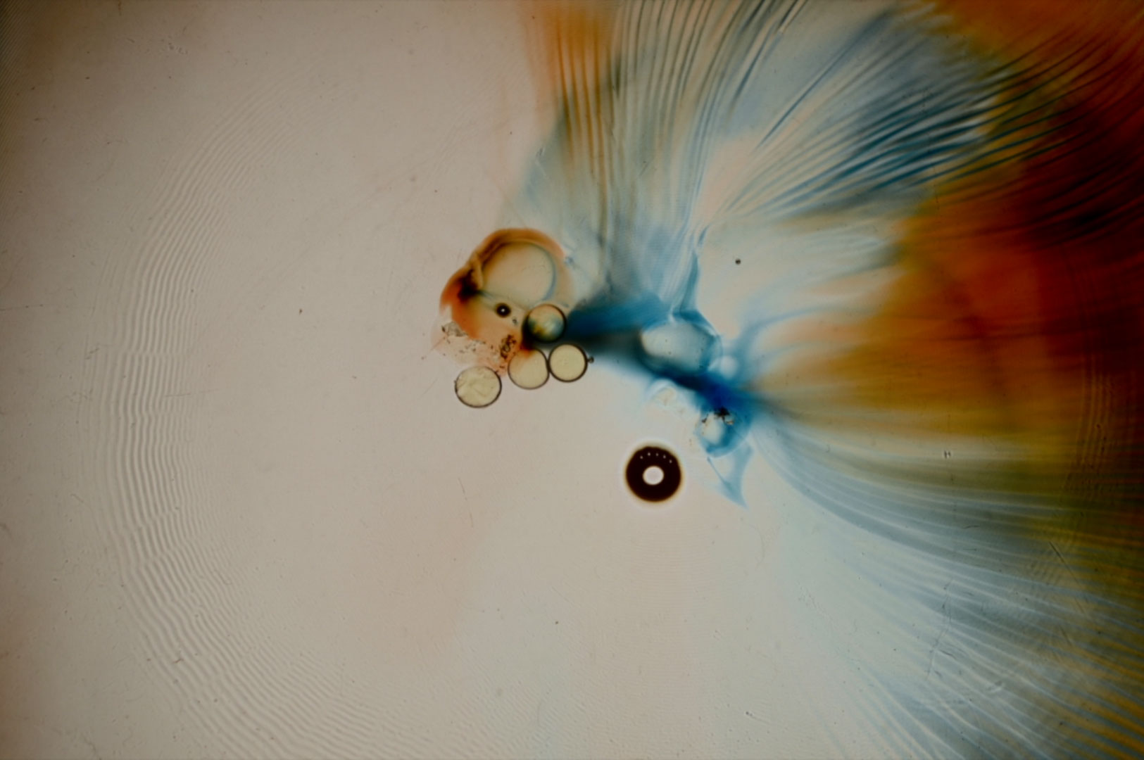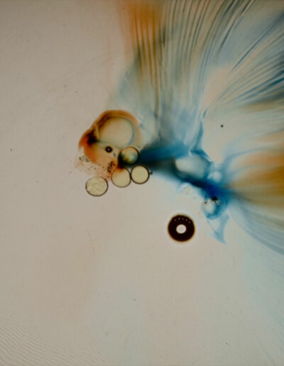 De ronde vormen, die vaker in haar werk voorkomen, staan voor gedachten-bubbels, die zomaar kunnen breken. De fluorkleur straalt uit, heeft geen echte grens. Net als gedachten. Zij kunnen ook oneindig zijn.