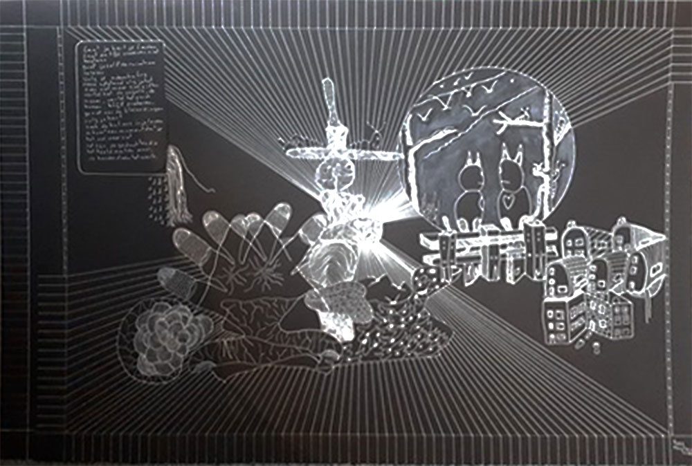 Voor het gedicht heeft zij o.a. zogenaamde kijkdoosjes gemaakt. Deze zijn in lagen opgebouwd net als een gedicht dat heeft.