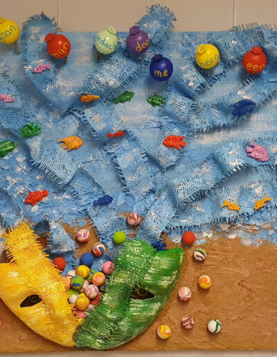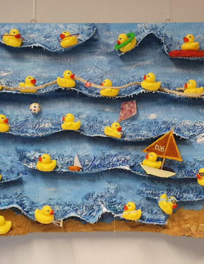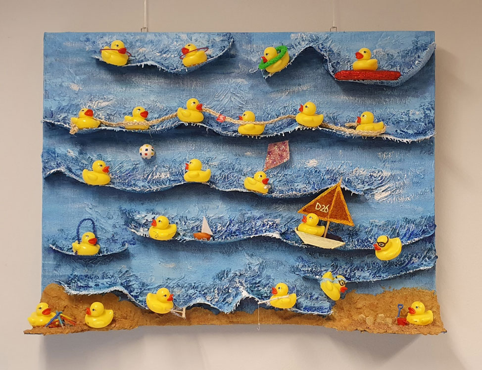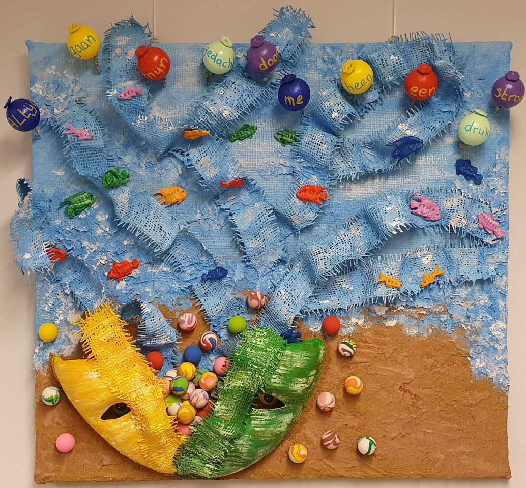 Met veel passie en plezier werkt Jolanda aan kleurrijke collages. Daarnaast heeft zij ruimtelijk werk gemaakt met daarin een tafereel van een jongetje. Alles op basis van het mooie gedicht van Eva Gerlach.