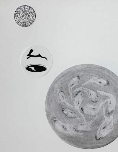 OI-inkt, houtskool, collage op papier ingelijst met fluorrand