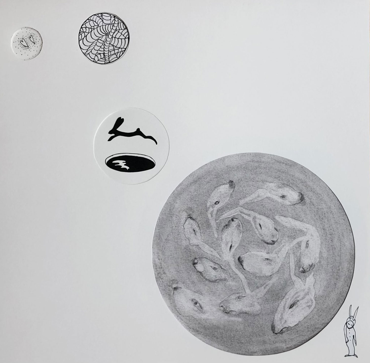 Niemand weet het zeker is al jaren het uitgangspunt voor haar seriematig tekenwerk. Een zelf bedacht sprookje waarin een Meisje, een Haas en een Huis, in steeds wisselende rollen vaste waarden zijn.
